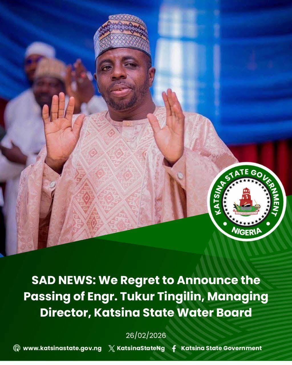 UPDATES: Katsina, February 27, 2026 — The Managing Director of the Katsina State Water Board, Engr. Tukur Hassan Tingilin, has died following an auto accident, throwing the agency and the wider state into mourning.