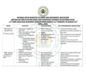 The Katsina State Ministry of Basic and Secondary Education has unveiled a Unified Action Plan to guide academic and administrative activities in all basic and secondary schools across the state for the second term of the 2025/2026 academic session.
